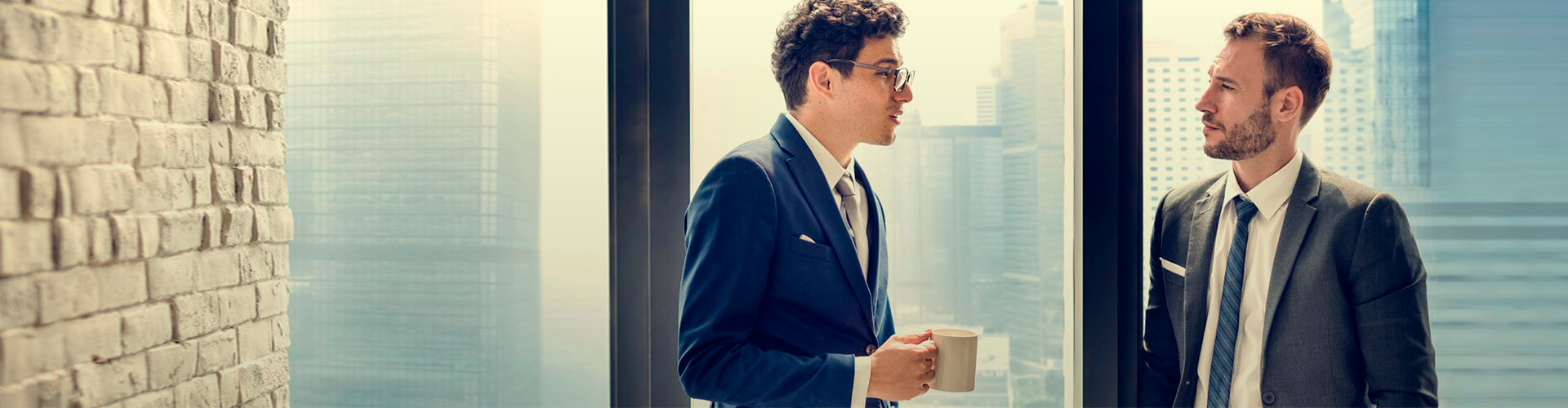 Momento Hacer que mi empresa crezca - Dos chicos jovenes con traje en oficina hablando mientras toman cafe junto a unas ventanas